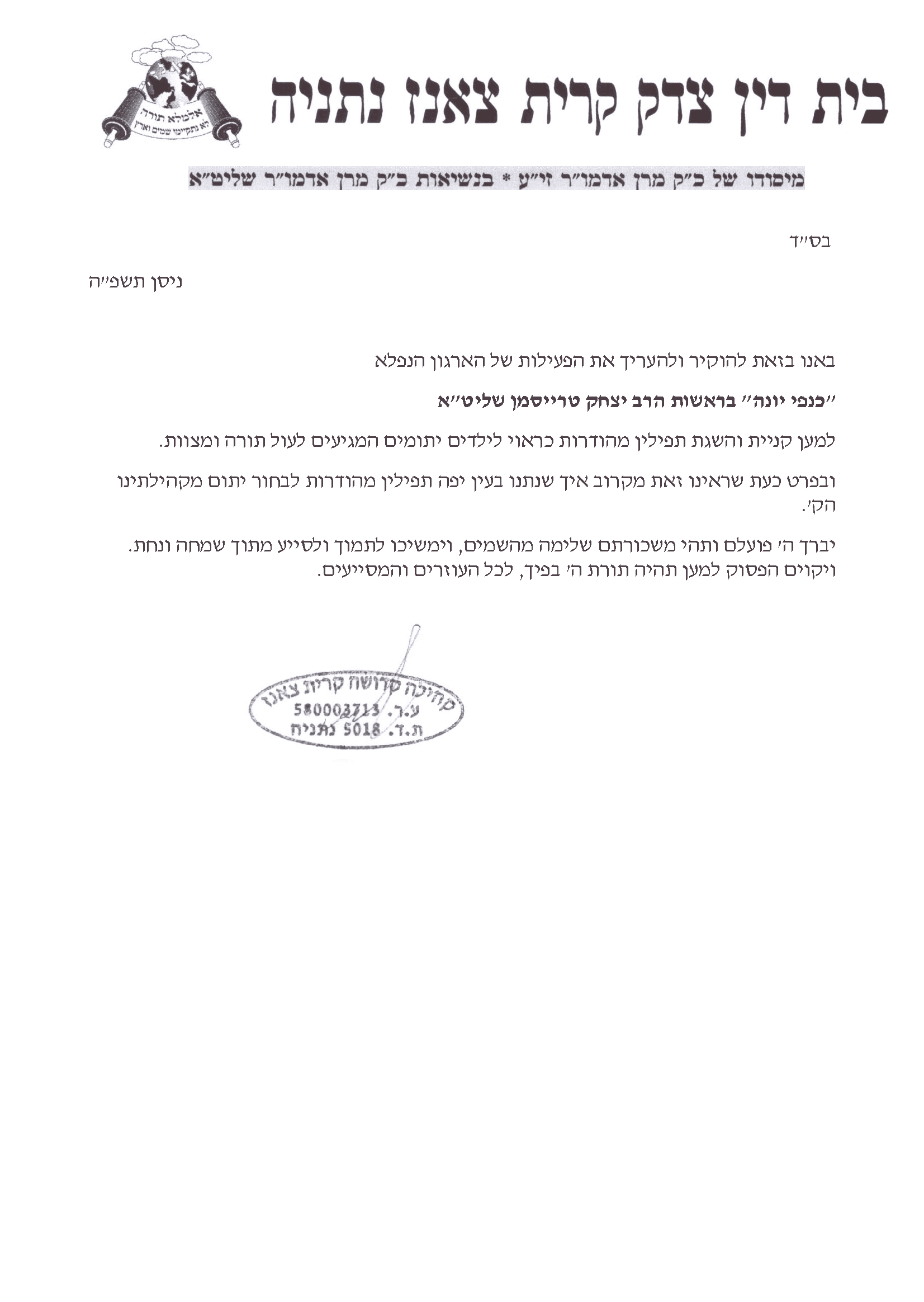 "To the chashuva organization "Kanfei Yonah"…I don't have enough words to thank you for your major assistance in acquiring mehudar tefillin, written by an experienced, yerei Shamayim sofer…from our hometown, Modi'in Illit… may you always have the zechus to accomplish great things."